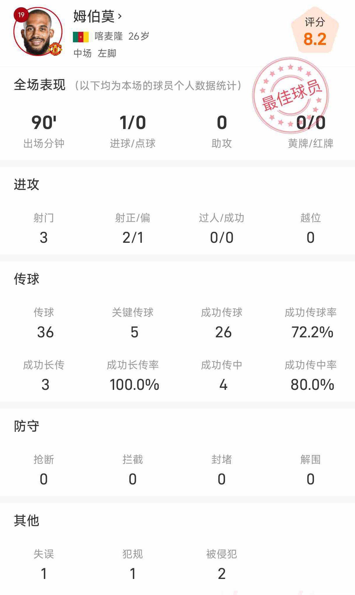 雷速体育8月31日讯 英超第3轮,曼联主场3-2险胜伯恩利。此役姆伯莫首发出场并且踢满了全场,比赛中他打入了1球。统计显示,姆伯莫本场比赛3次射门,2次射正,打入1球。他有36次传球,26次成功,传球成功率80%。有5次关键传球。3次成功长传,4次成功传中。姆伯莫在比赛中还有1次失误,1次犯规,2次被侵犯。...